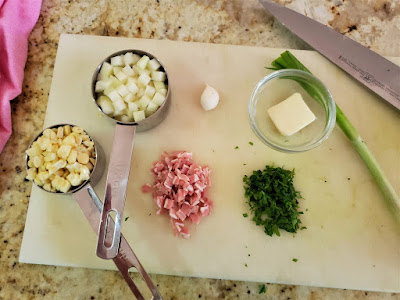While the garlic cream cooks, prepare the toppings: slice the scallion very thinly on a long bias.